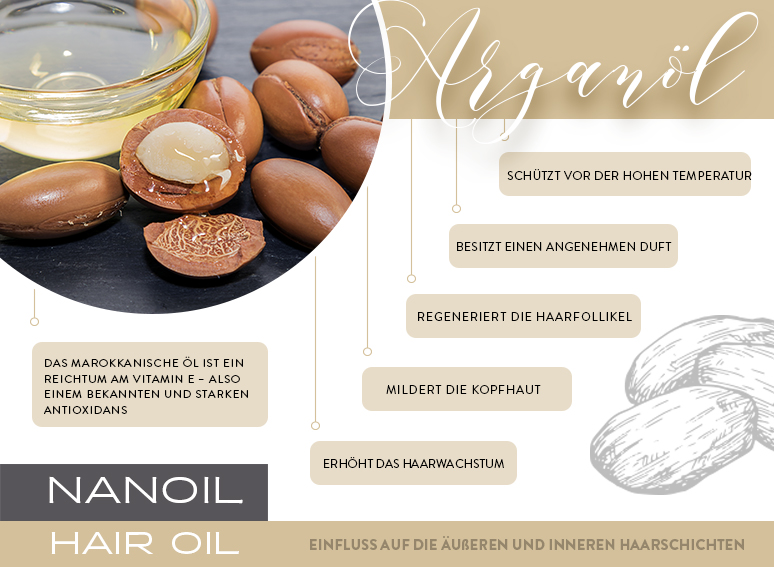 Frauen aus aller Welt haben sich ins Arganöl verliebt, weil es wunderbare Eigenschaften im Rahmen der Kosmetik garantiert. Heutzutage hat es seinen festen Platz in fast jeder Kosmetiktasche – entweder das reine Öl oder eine Zutat der Pflegeprodukte. Es lässt sich jetzt in zahlreichen Cremes, Haarspülungen, Masken, Körperlotionen, Shampoos und sogar dekorativen Kosmetikprodukten finden. Das marokkanische Arganöl revitalisiert die Haut und das Haar, verlangsamt die Alterungsprozesse, liefert Nährstoffe, verjüngt und schützt vor den schädlichen, äußeren Einflüssen. Es lohnt sich, nach dem Arganöl in guten Haarpflegeprodukten zu suchen. Das kosmetische Arganöl befindet sich in jedem der drei Haaröle Nanoil – für Haare mit hoher, normaler und niedriger Porosität. Seine ausgezeichneten Eigenschaften intensivieren die Wirkung jedes der drei Kosmetikprodukte und garantiert den Haaren einen wunderbaren Schutz. In Nanoil-Produkten gibt es da originale Arganöl von der höchsten Qualität.